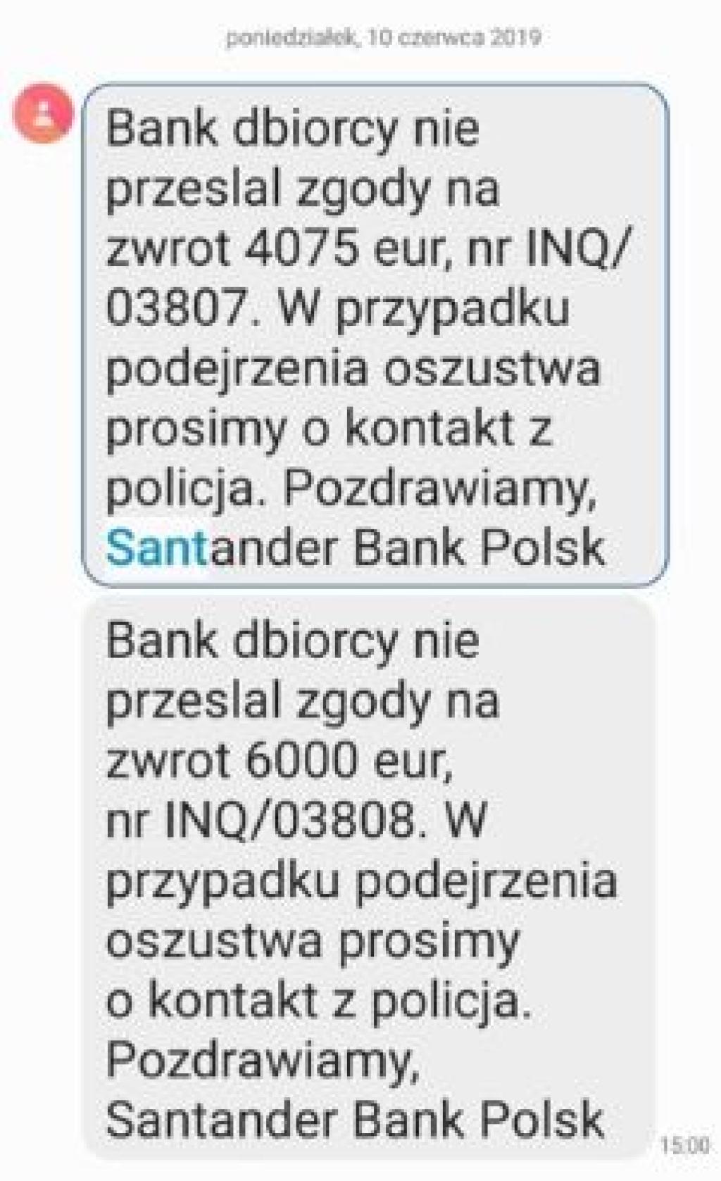 - Czy bank to polecenie wykonał w sposób skuteczny? Moim zdaniem nie. Po 2,5 miesiącach czyli 10 czerwca 2019 roku dostałam SMS-a z Santander Bank Polska z błędami ortograficznymi, że "Bank dbiorcy nie przeslal zgody na zwrot 4075 eur i 6000 eur". O trzecim przelewie na kwotę 6792 euro do dzisiaj nie mam z Santander żadnej informacji! - skarży się poszkodowana kobieta.