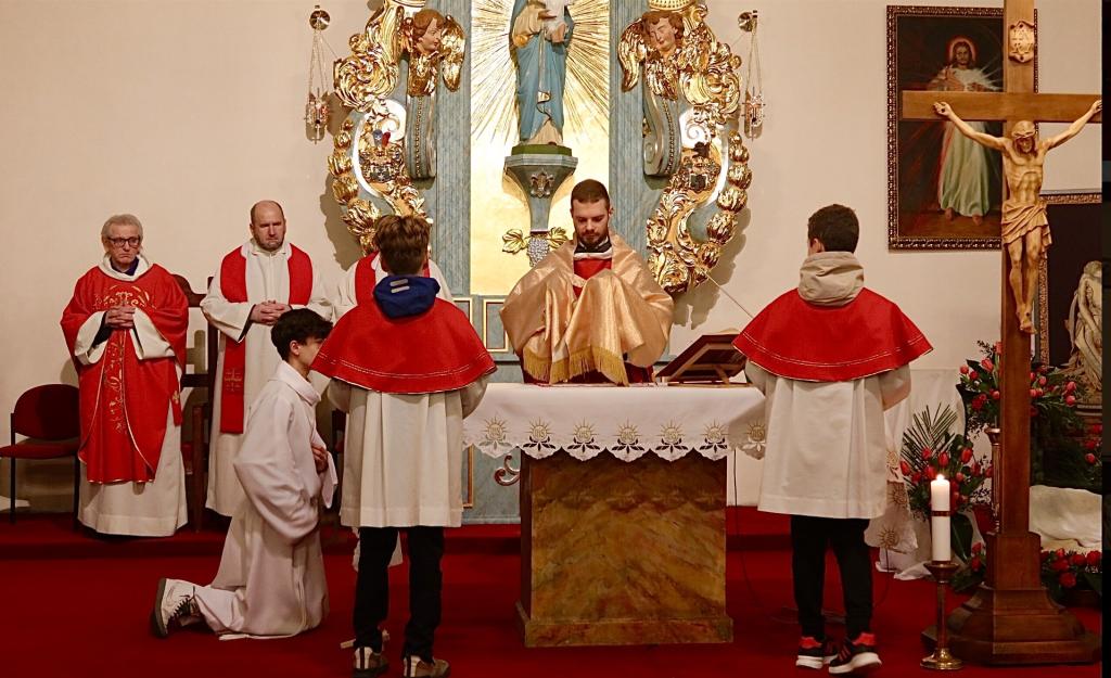 A obok krzyża Jezusowego stały: Matka Jego i siostra Matki Jego, Maria, żona Kleofasa, i Maria Magdalena. Kiedy więc Jezus ujrzał Matkę i stojącego obok Niej ucznia, którego miłował, rzekł do Matki: † Niewiasto, oto syn Twój. E. Następnie rzekł do ucznia: † Oto Matka twoja. E. I od tej godziny uczeń wziął Ją do siebie.
